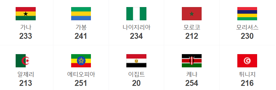 | 알제리 | 에티오피아 | 이집트 | 케냐 | 튀니지 |