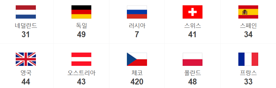 | 네덜란드 | 독일 | 러시아 | 스위스 | 스페인 |