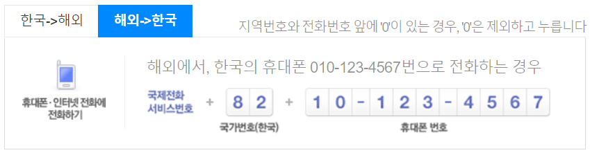 해외에서 한국 휴대폰 010-123-4567번으로 전화하는 경우
