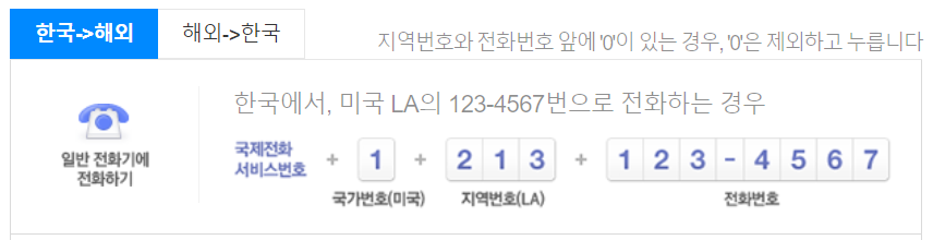 [국제전화 서비스번호 + 국가번호(미국) + 지역번호(LA) + 전화번호]