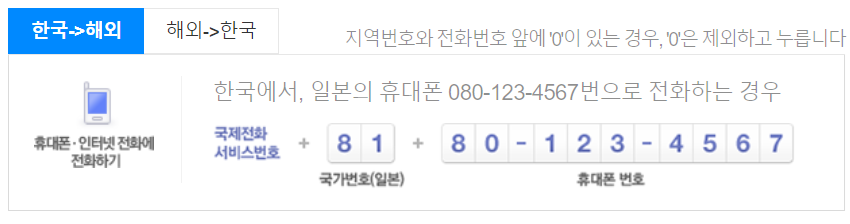 한국에서 일본 휴대폰 080-123-4567번으로 전화하는 경우