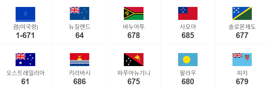 네이버에서 제공하는 국제전화 국가번호를 확인해보세요. 나라국기를 누르면 지역번호까지 같이 제공됩니다.
