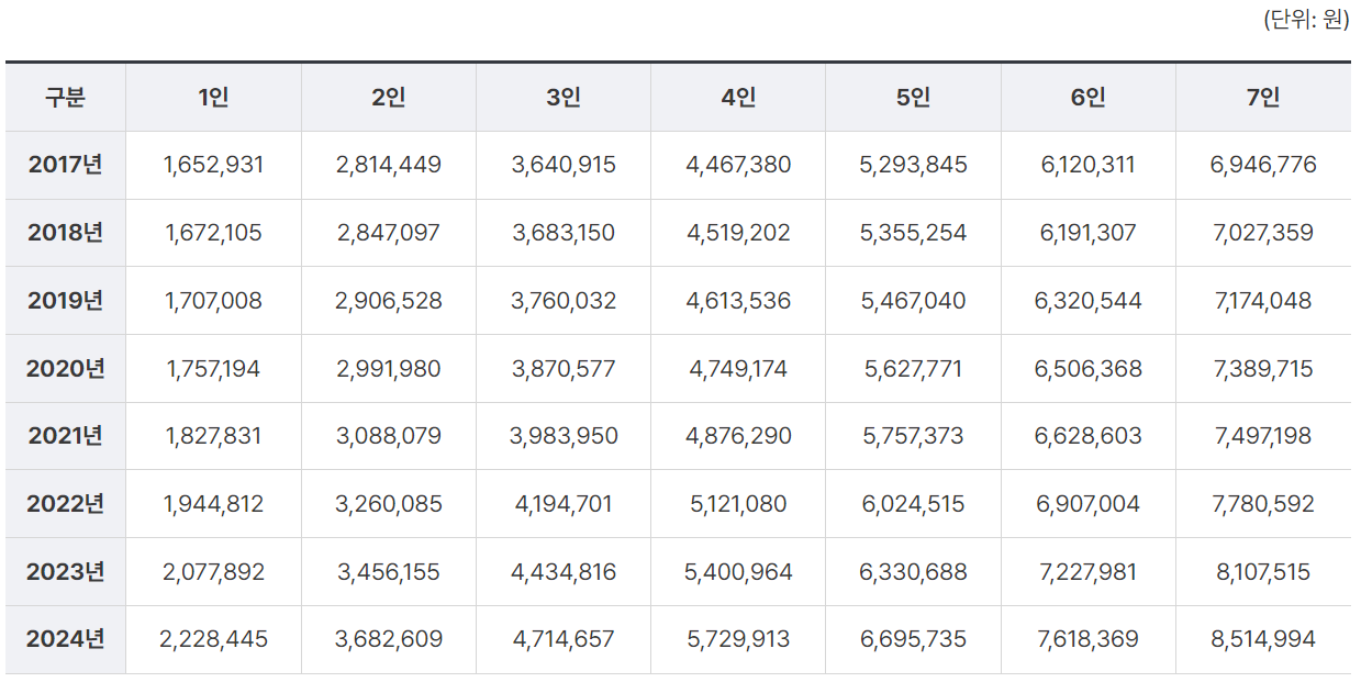 2024년도 기준중위소득은 아래 표를 확인하시기 바랍니다.