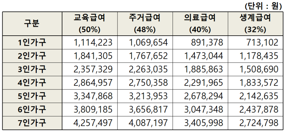 기초생활수급자 생계급여가 국민 중위소득 30%에서 2024년도에는 32%로 증가되었습니다. 생계급여액이 인상되어 4인가구 생계급여액은 162만1천원에서 늘어난 금액 183만4천원으로 지급합니다. 주거급여는 47%에서 48%로 증가되었습니다.