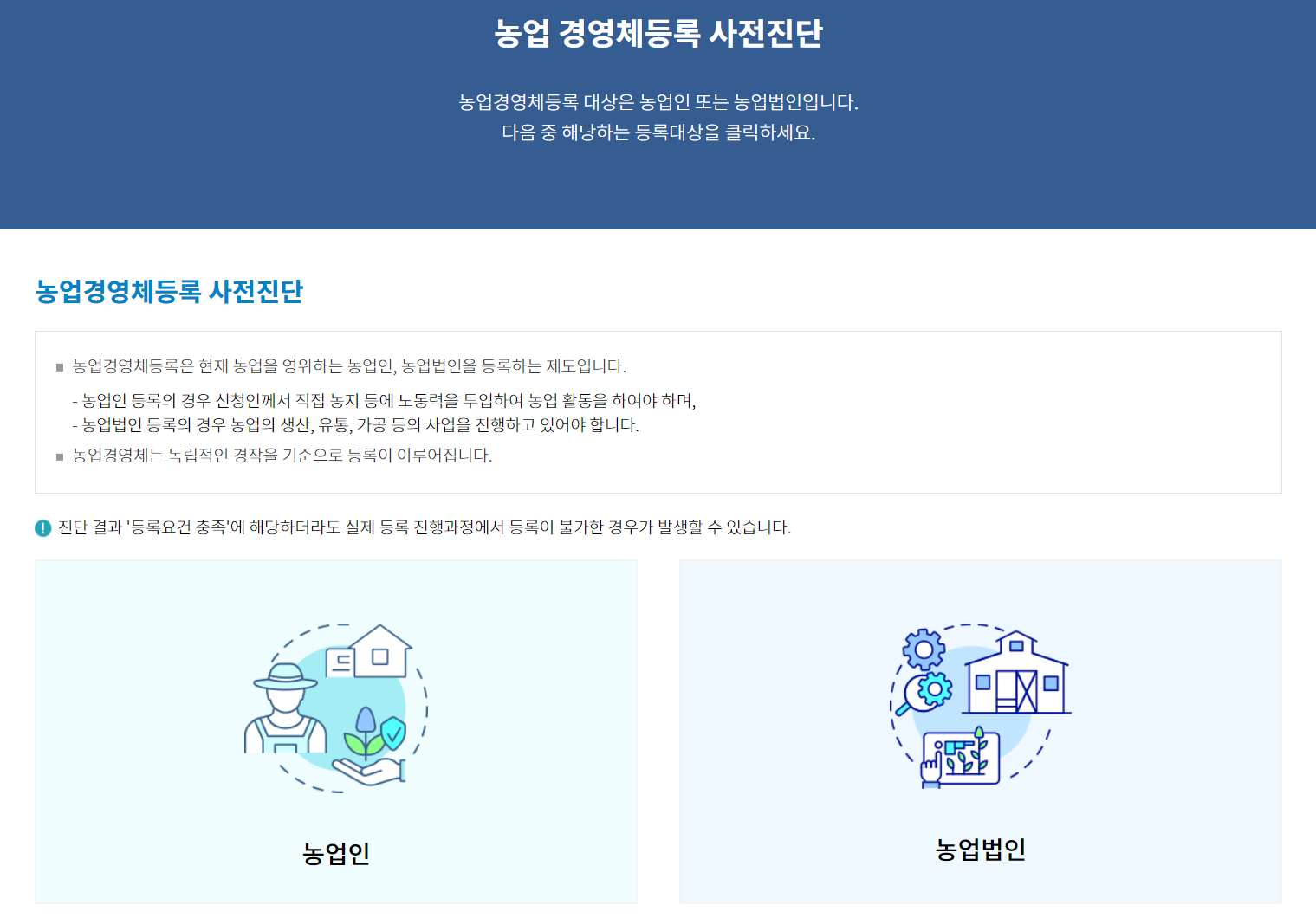 농업경영체 등록을 하기 전, 농업인과 농업법인이라면 미리 등록이 가능한지 진단이 가능합니다.