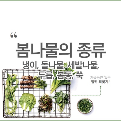 그때 그시기에 나는 제철음식이 몸에 좋다고 하죠. 우리나라 대표적인 봄나물은 냉이, 돌나물, 세발나물, 두릅, 봄동, 쑥, 미나리 등이 있습니다.