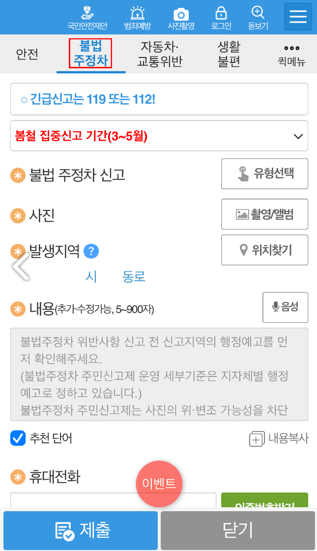 2022년 5월부터 불법주차 신고가 주민신고제로 변경 운영되면서 단속 공무원의 현장 출동 없이도 가능하게 되었습니다. 상당히 번거로울 수 있는 일이지만 불법주차된 차량이 있다면 안전신문고앱으로 신고하셔서 불편함을 없애시기 바랍니다.