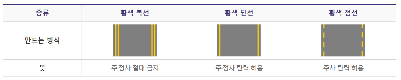 황색 복선(노란색 두개의 선)은 주차와 정차가 모두 금지됩니다. 황색 단선(노란색 한개의 선)은 주차 또는 정차가 탄력적으로 허용됩니다. 황색 점선은 주차가 탄력 허용됩니다.