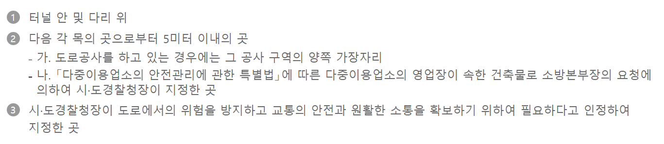 ◆ 도로공사를 하고 있는 경우에는 그 공사 구역의 양쪽 가장자리, 다중이용업소의 영업장이 속한 건축물로 소방본부장의 요청에 의하여 시, 도경찰청장이 지정한 곳