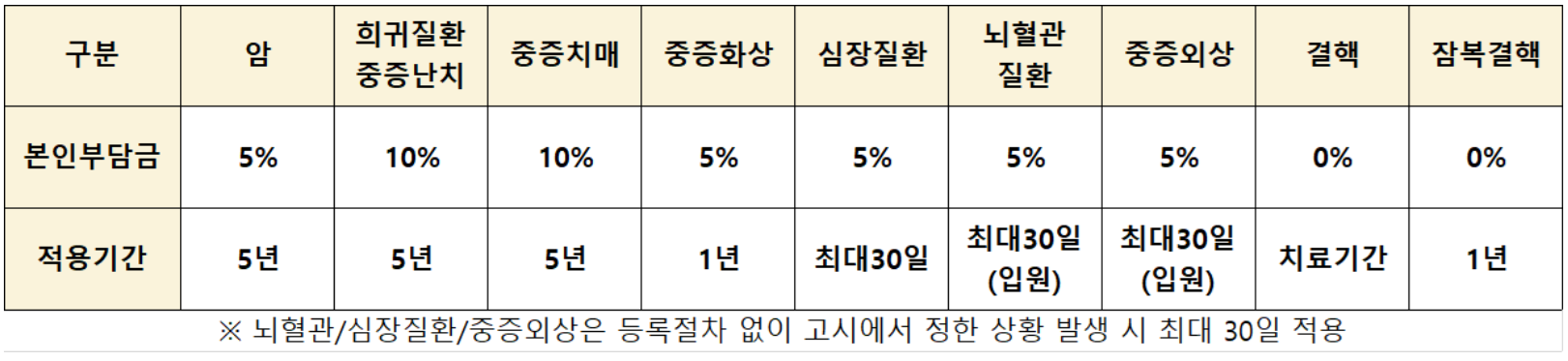 주의할 점은 비급여 항목, 입원기간 중 식대, 2인실 또는 3인실 입원료 등은 적용되지 않습니다. 질병코드에 따라 산정특례 적용이 불가한 경우도 있으니 수납시에 잘 확인해야 합니다.