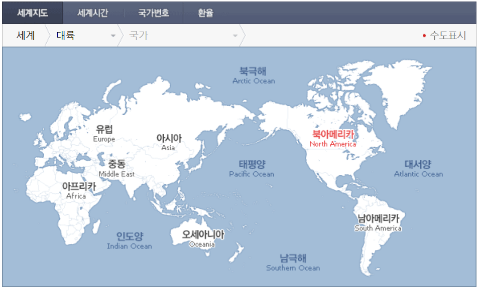 북아메리카에 마우스를 갖다댔을 때 붉은글씨를 클릭합니다.