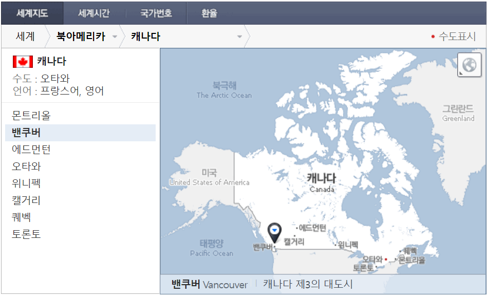 캐나다 나라의 수도와 언어가 표시되며 지역명을 누르면 간단한 설명이 나옵니다.