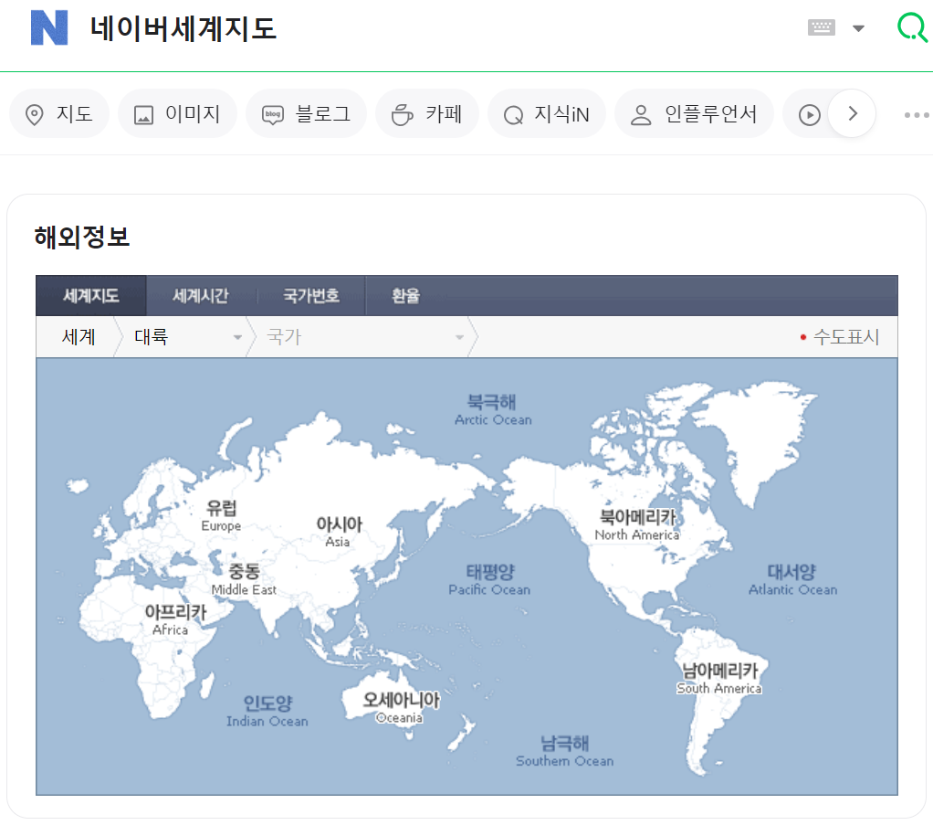 포털사이트 네이버에 접속하셔서 [네이버세계지도] 검색을 하면 바로 아래 세계지도가 나옵니다.