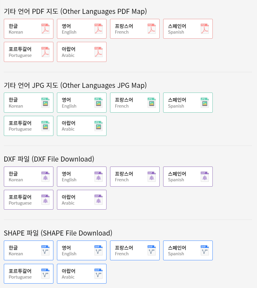 국가별 언어로 그리고 pdf, jpg, dxf, shape 등 다양한 확장자로 다운도 가능합니다.