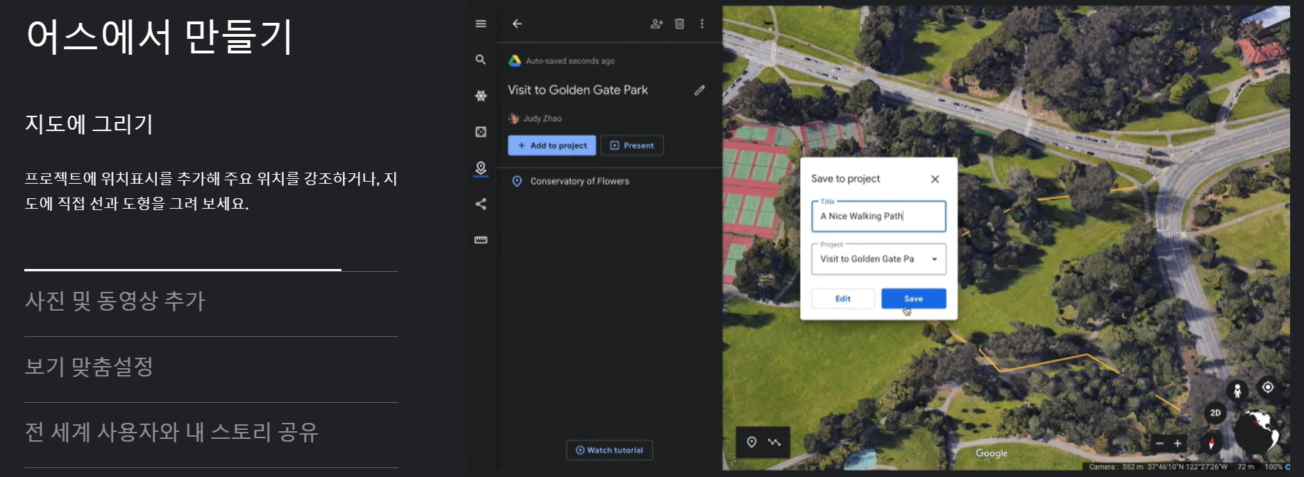 지도에 직접 선과 도형을 그릴 수 있고 3D보기를 저장하거나 360도로 이미지 확인도 가능합니다. 세상에서 가장 정교한 디지 지구본이라고 할 수 있습니다.