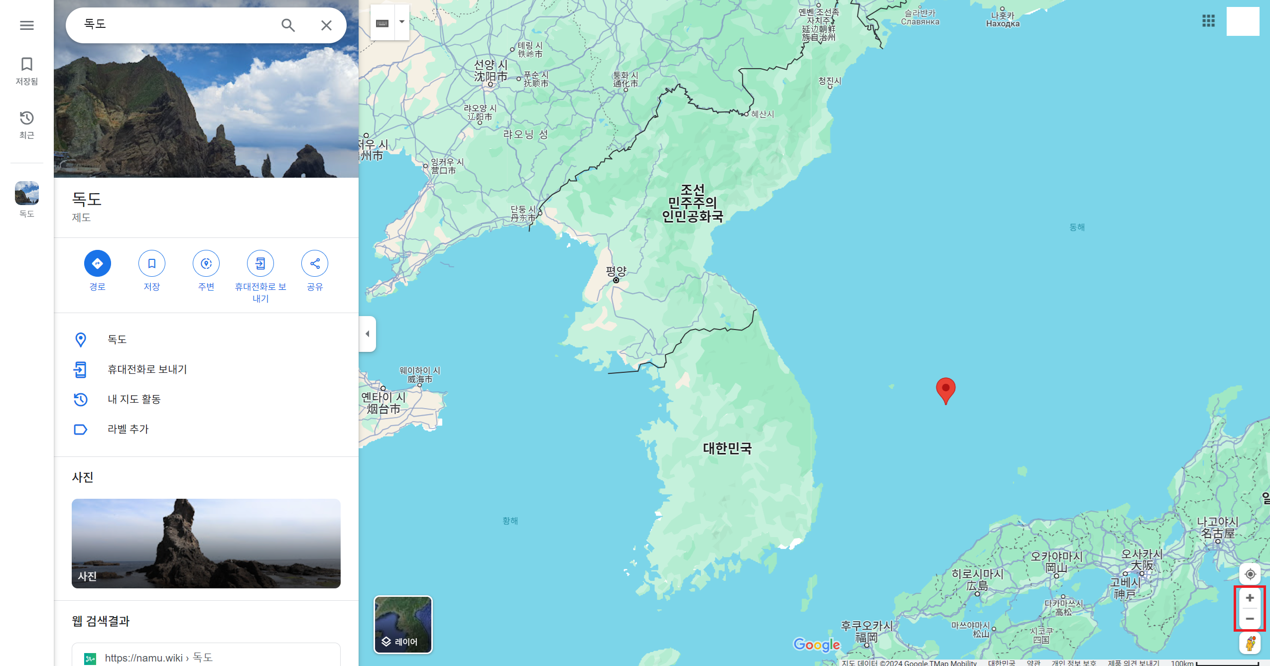 오른쪽 하단에 +(플러스), -(마이너스)를 눌러 확대와 축소가 가능합니다. 왼쪽 돋보기 검색란에 원하는 지역을 검색할 수도 있습니다.