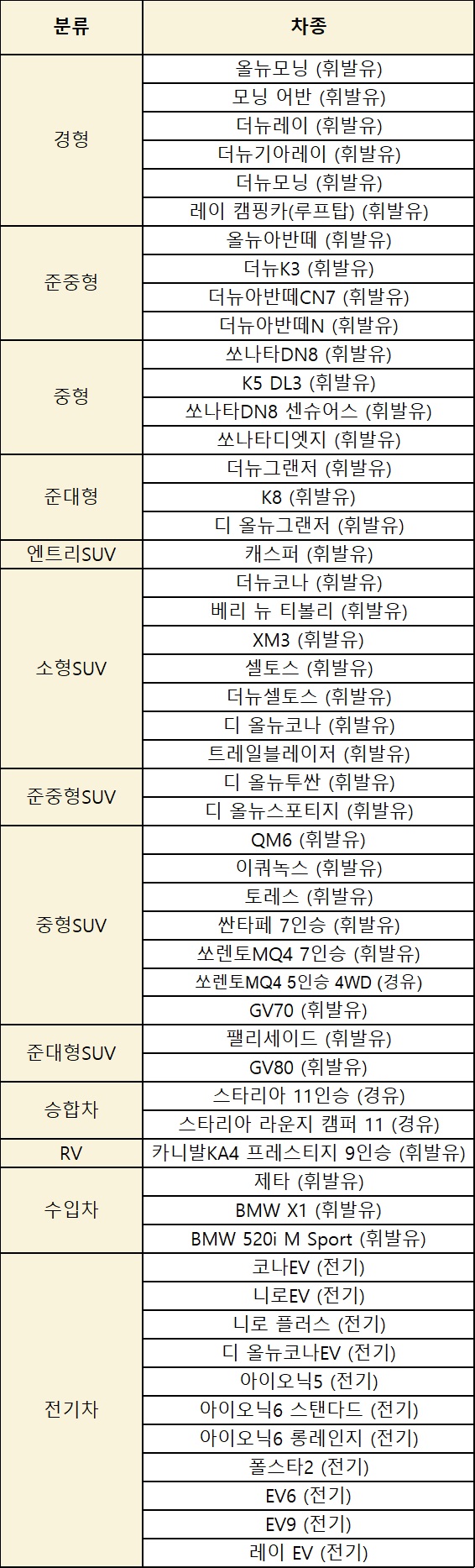 차량의 종류는 경형, 준중형, 중형, 준대형, 앤트리suv, 소형suv, 준중형suv, 중형suv, 준대형suv, 승합차, rv, 수입차, 전기차 등 다양합니다.