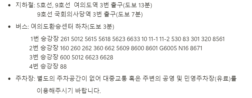 - 5호선 여의도역 3번 출구에서 약 568m (도보 11분)