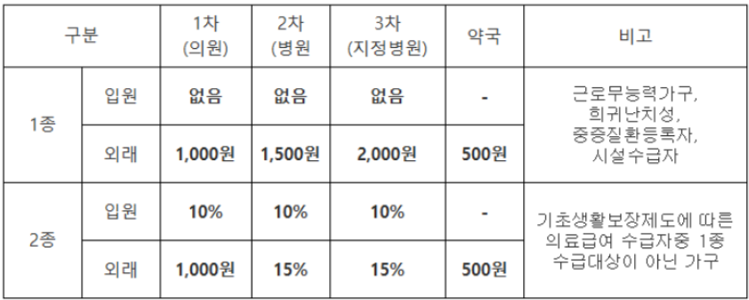 2024년의 의료급여는 1종 수급권자의 경우 입원은 전액지원되며 외래의 경우 500원에서 2,000원까지 정액으로 본인이 부담합니다. 2종은 입원 10% 본인이 부담하며 외래는 정률제와 정액제 병행 운영됐습니다.