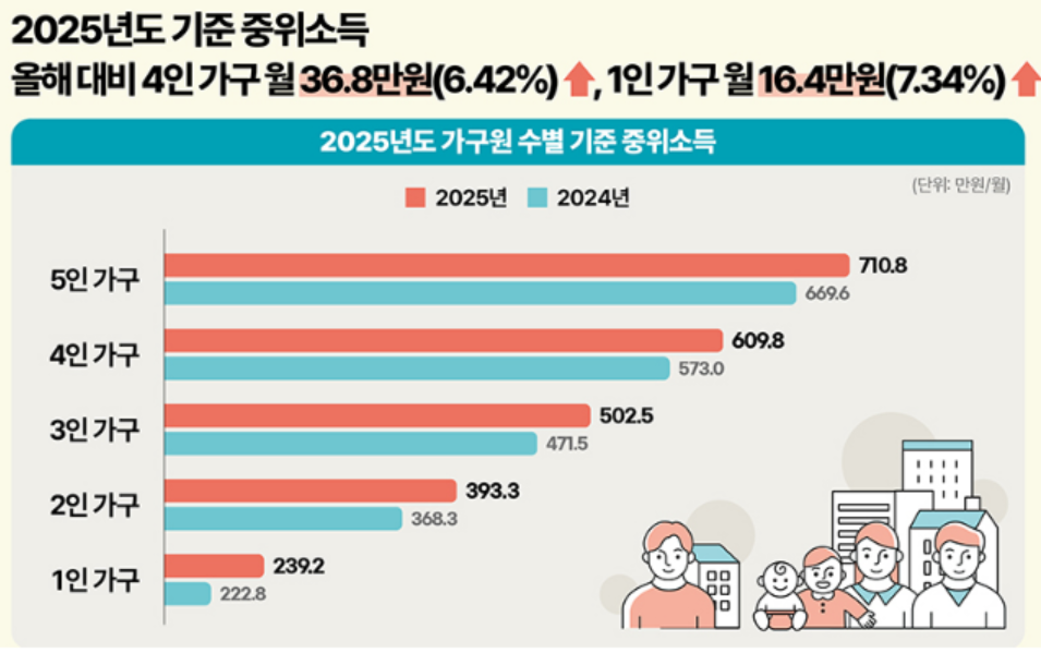 2025년 기준 중위소득은 2024년 대비 +6.42%로 큰폭 인상됐습니다. 4인 가구 기준 중위소득은 609.8만원으로 전년도보다 +36.8만원 인상되었습니다.