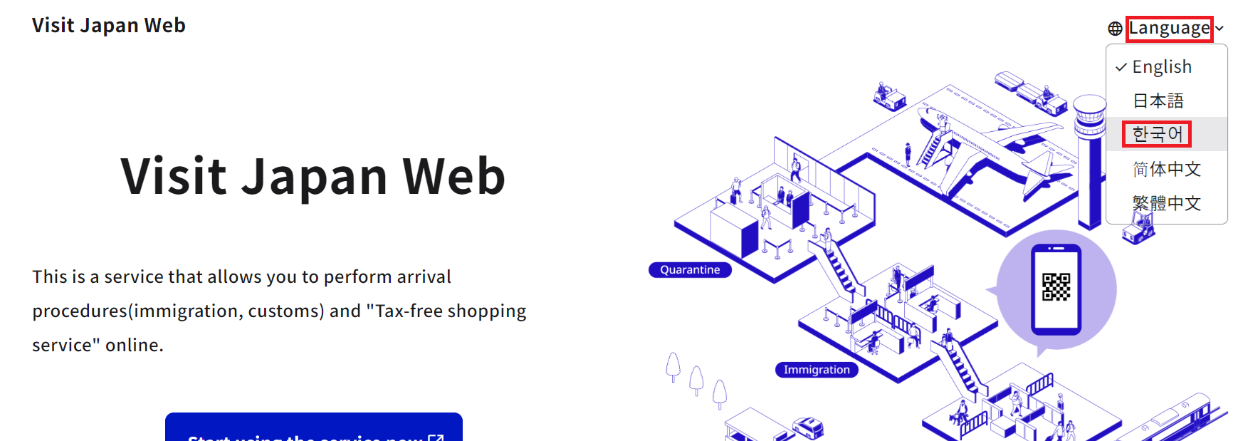 비짓재팬 웹 사이트는 한국어로 번역하여 이용할 수 있습니다. 접속하면 오른쪽 상단위에서 언어를 변경해줍니다.