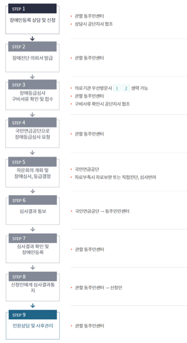 3. 국민연금 공단에 신청하여 장애등록 심사를 진행합니다. 장애 등급 판정 등록이 승인되면 국민연금공단에서 주민센터로 통보됩니다.