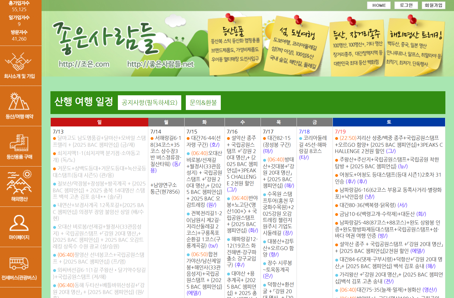 좋은사람들 산악회는 오랜 기간 동안 등산을 사랑하는 사람들을 위해 운영되어 온 전문 산악회입니다. 주말이나 공휴일을 활용한 정기 산행, 자연 체험, 가족 단위 산행, 직장인 힐링 산행 등 다양한 프로그램이 마련되어 있어 연령과 성별에 상관없이 누구나 참여할 수 있습니다. 특히 공식 홈페이지인 더알파인에서는 매주 상세한 산행 일정과 코스 안내, 참가비, 준비물, 출발지 정보 등이 명확하게 제공되고 있어 이용자들에게 매우 편리한 시스템으로 평가받고 있습니다.