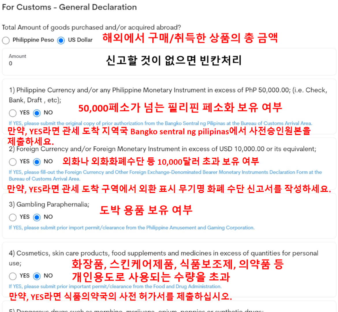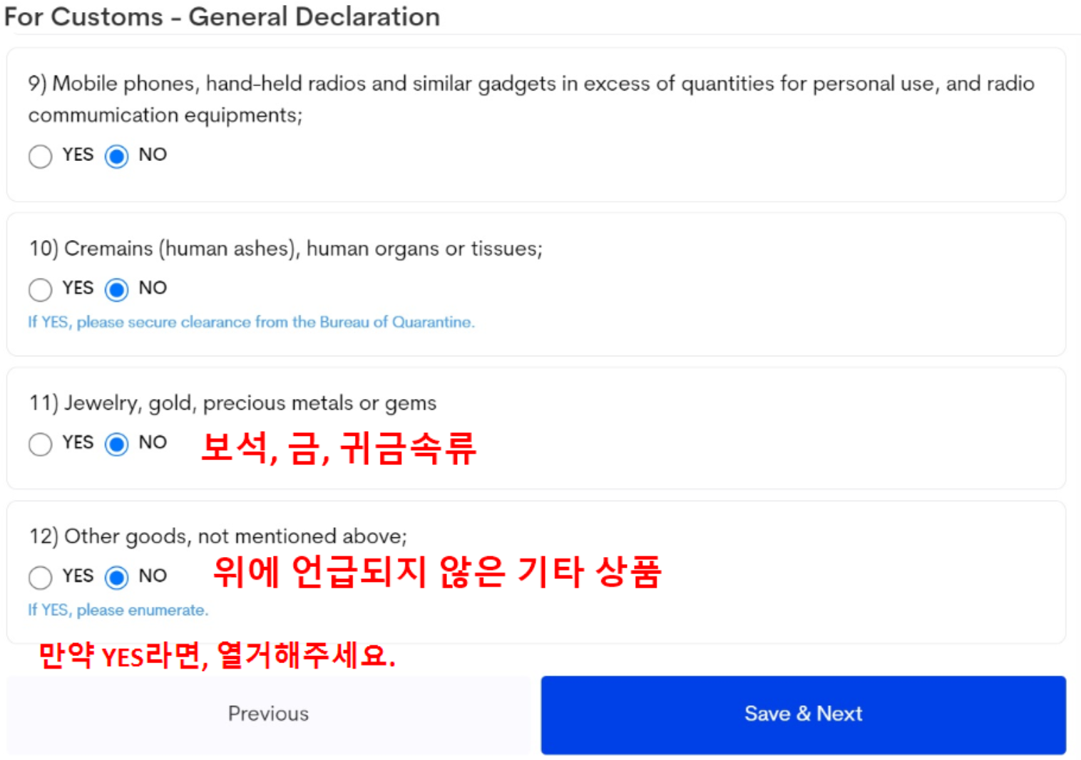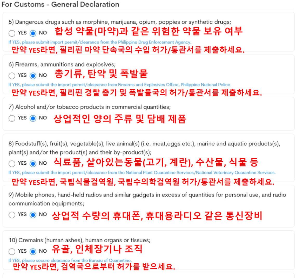 4. 세관신고서 내용에서 물건을 갖고 있지 않다면 NO를 모두 선택하고 넘어가면 됩니다. 만약 해당하는 물건이 있어서 YES를 선택했다면, 반입관련 허가서를 업로드 해야 합니다.