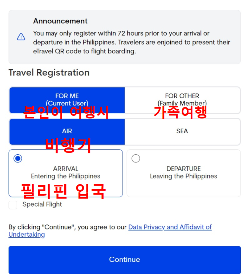 1. 항공기 탑승 시간 기준으로 72시간 이내에 등록이 가능합니다. 본인이라면 FOR ME, 가족 여행시 FOR OTHER을 클릭합니다. Special Flight는 특별기나 전세기 항공편 이용 시 선택하면 됩니다.