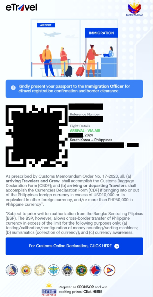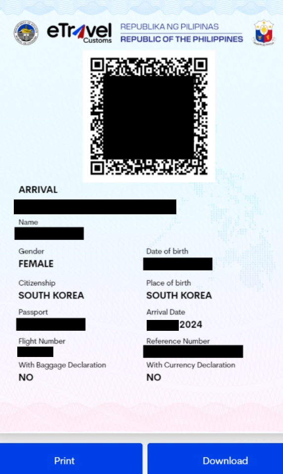 이트래블을 통해 입국신고서와 세관신고서를 완료하면 QR코드가 발급되는데 이 때 캡쳐하거나 사진을 저장해서 필리핀 공항에서 제시하면 됩니다.