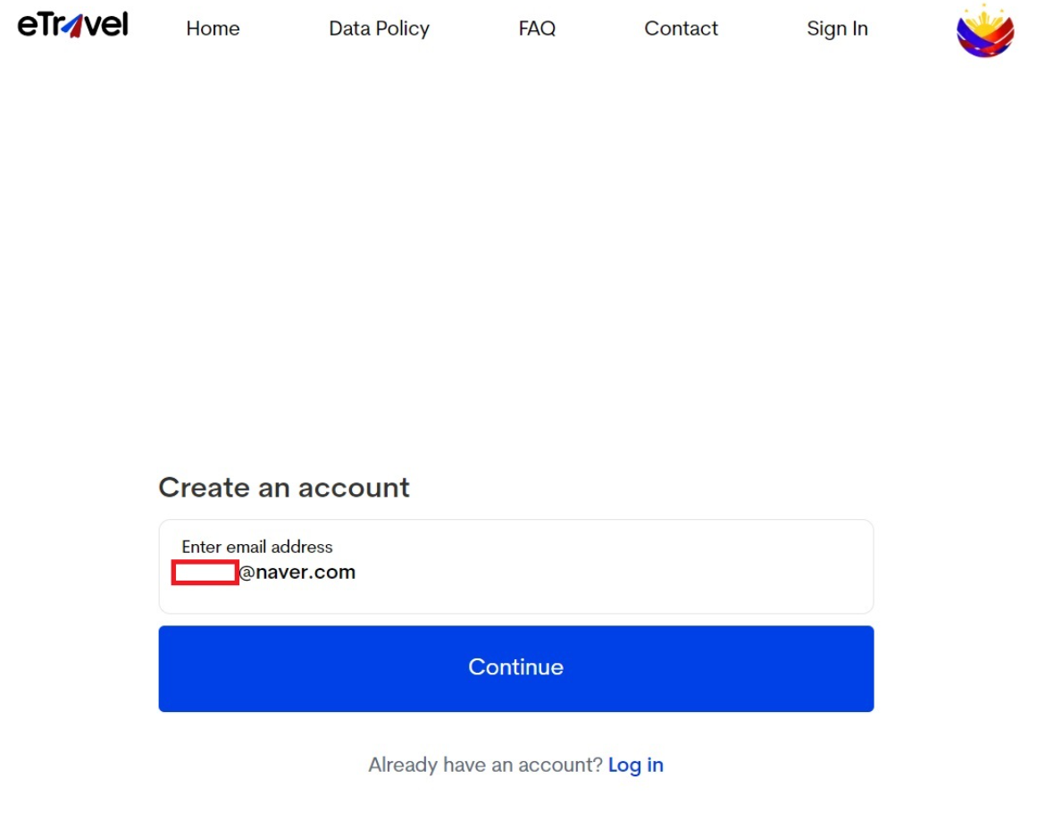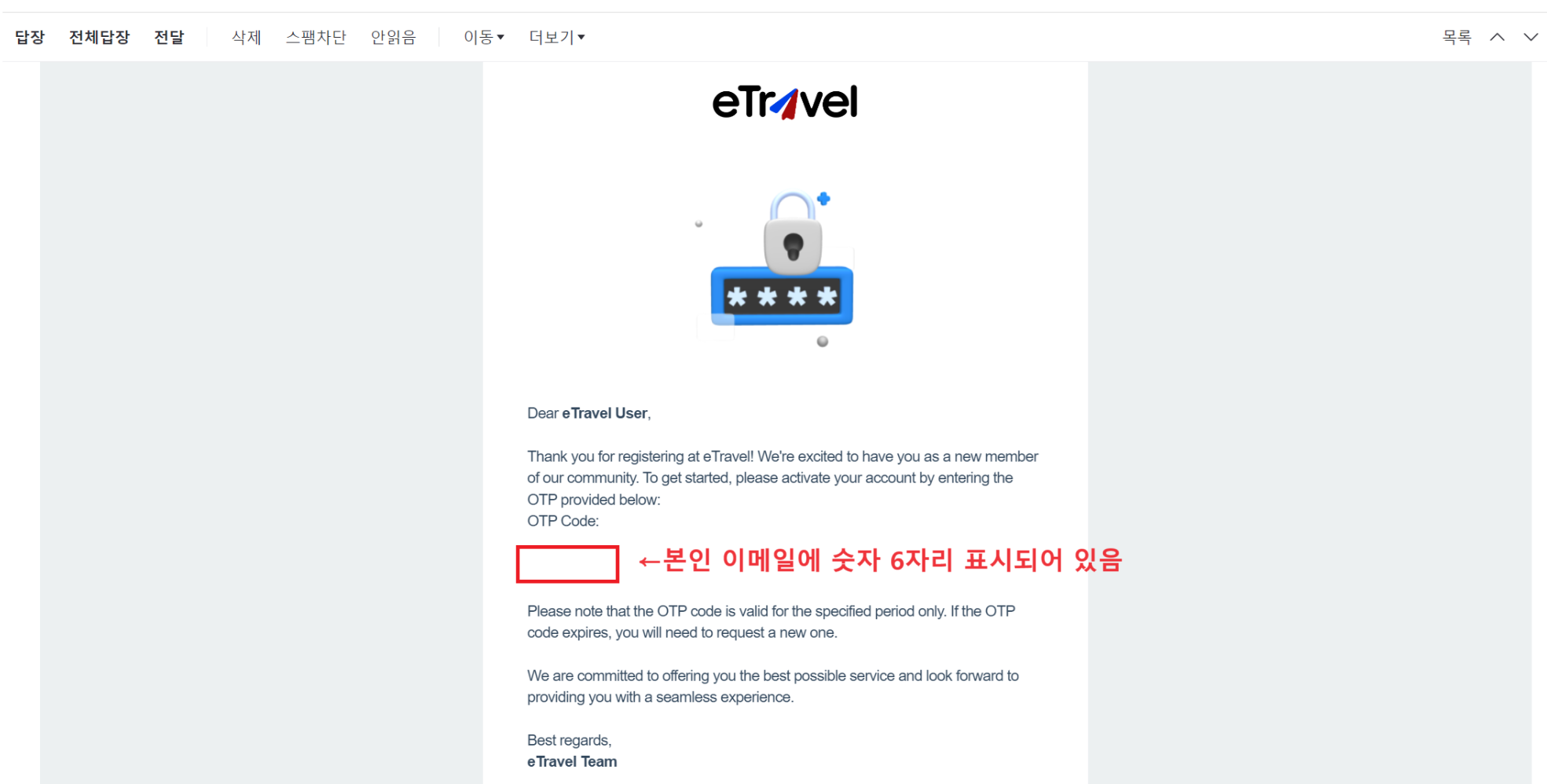 아이디로 사용할 이메일 주소 입력 후 Continue를 누릅니다. 이메일로 받은 OTP 보안코드 6자리 숫자를 이트래블 페이지에서 입력합니다.