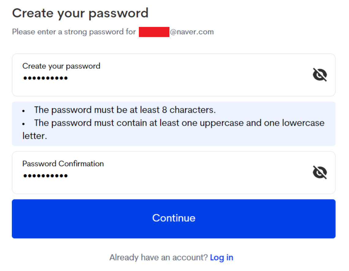이트래블에서 사용할 비밀번호를 생성하고 Continue를 클릭합니다. 8자 이상의 비밀번호로, 대문자와 소문자 각각 하나 이상 포함해야 합니다.