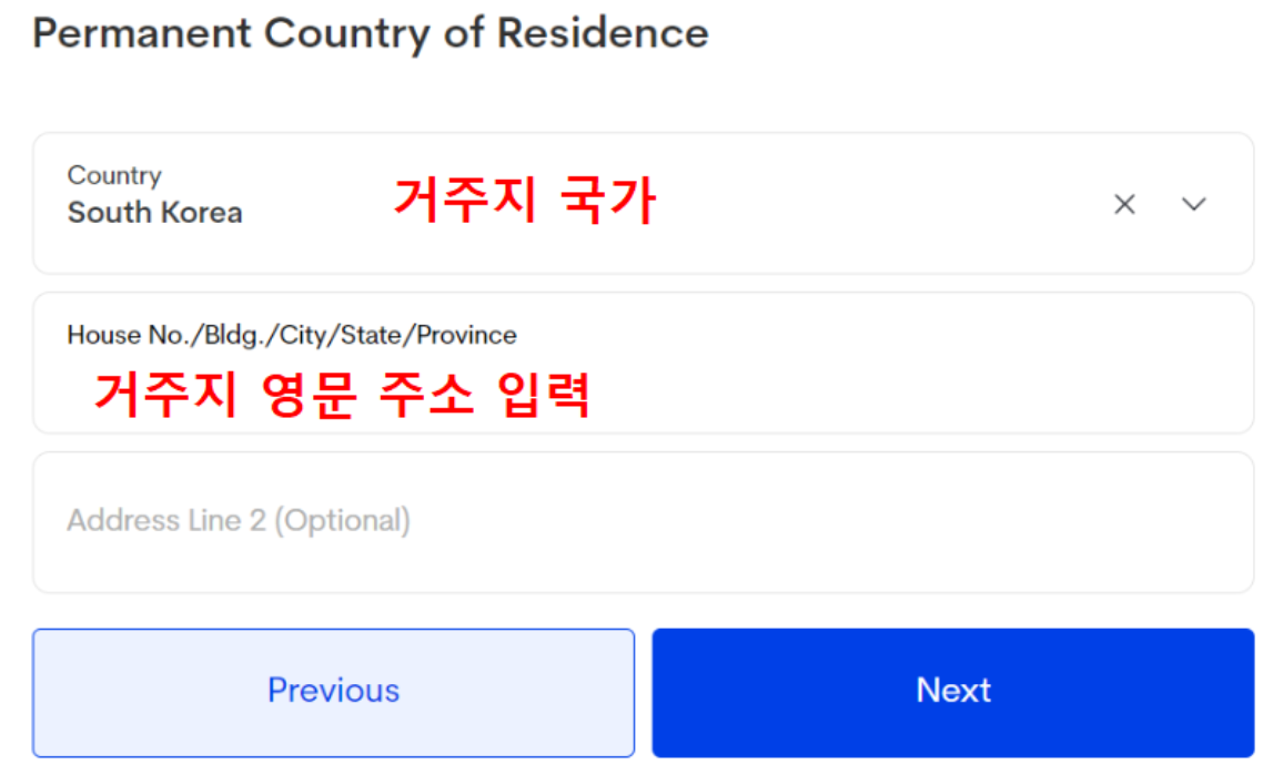 한국인이라면 외국인 여권 소지자를 클릭, 이름과 성 그리고 성별, 생년월일, 핸드폰번호, 국적, 출생지, 여권번호를 모두 입력합니다. Next를 클릭 후 거주지 국가, 살고 있는 거주지를 영문 주소로 입력합니다.