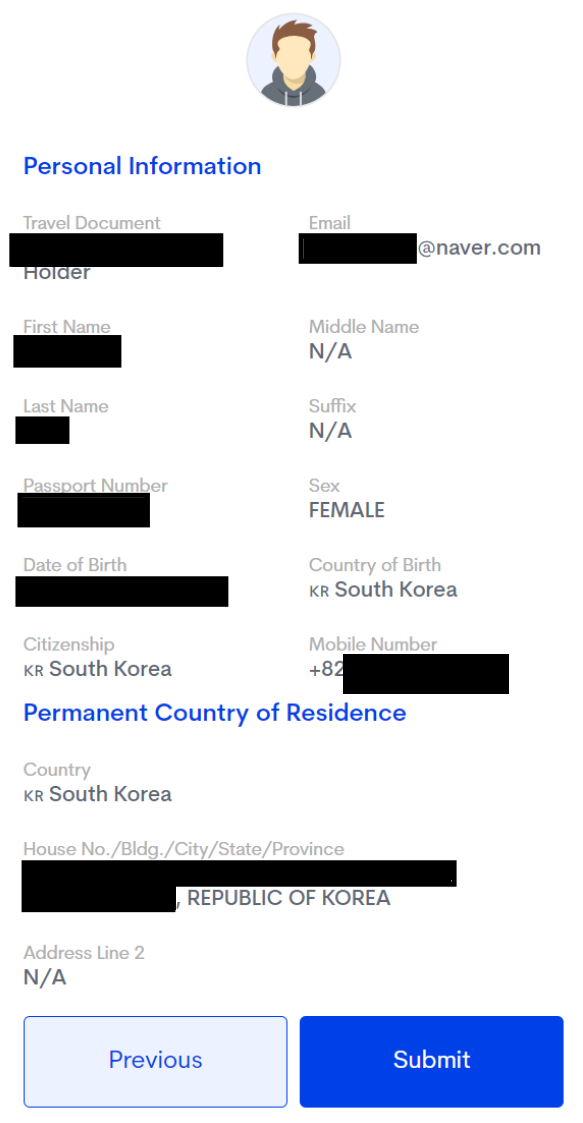 개인정보, 거주지 입력을 다시 한번 검토하고 맞으면 Submit 버튼을 클릭합니다. 회원가입은 마쳤습니다. 항공기 출발시간 72시간 이내에 다시 이트래블 사이트에 들어와서 입국신고서와 세관신고서를 작성하면 됩니다.
