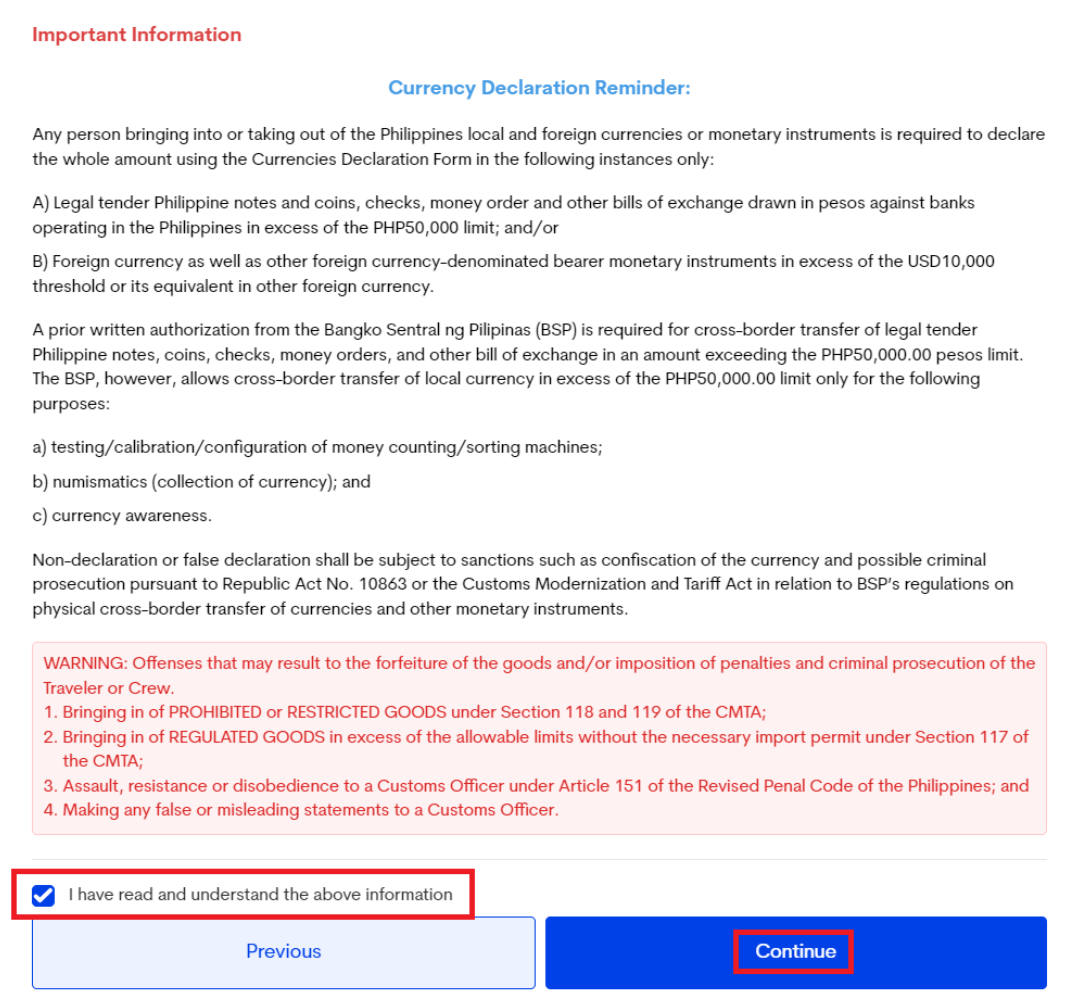 2. 세관신고 내용을 이해했다면 체크박스에 체크후 Continue를 누릅니다.