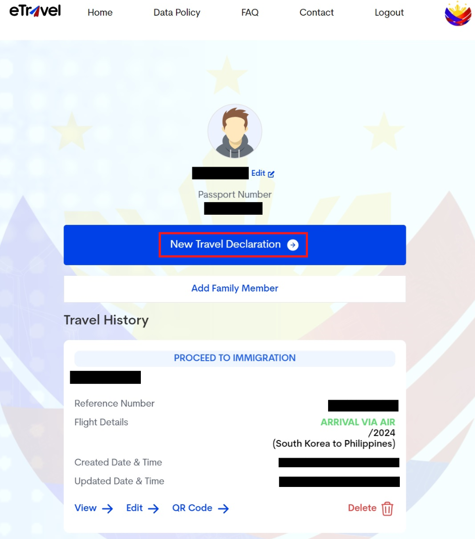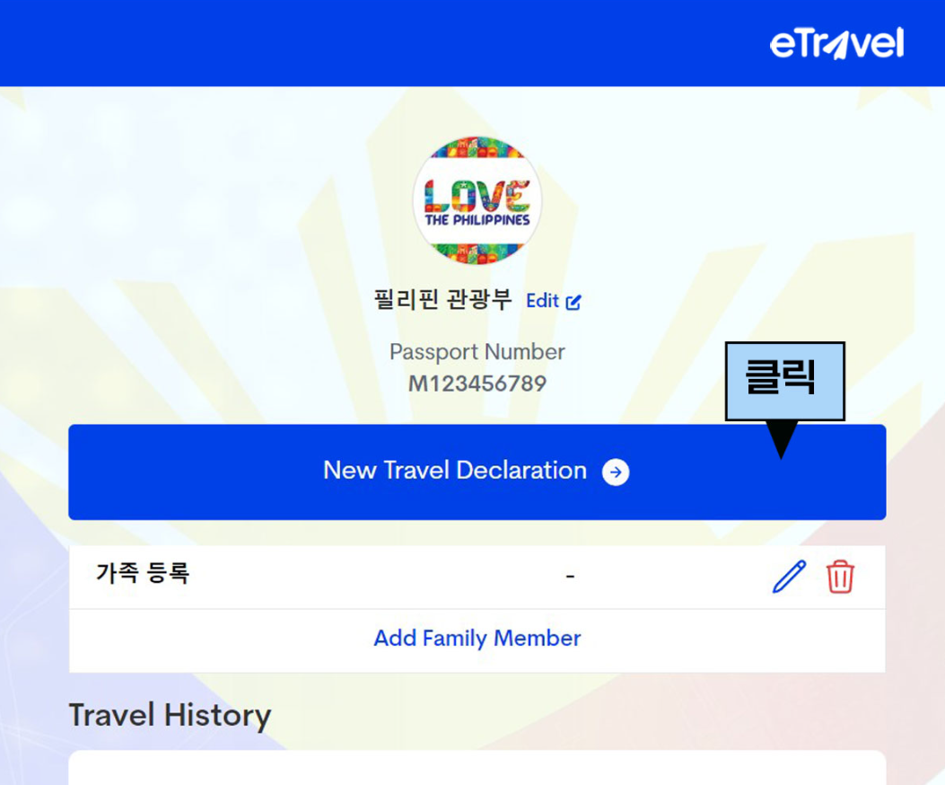 이트래블 사이트에 로그인한 상태에서 New Travel Declaration을 클릭하여 가족을 추가할 수 있습니다. 가족들도 모두 큐알코드를 캡쳐하여 큐알코드 사진을 저장해두어야 합니다.