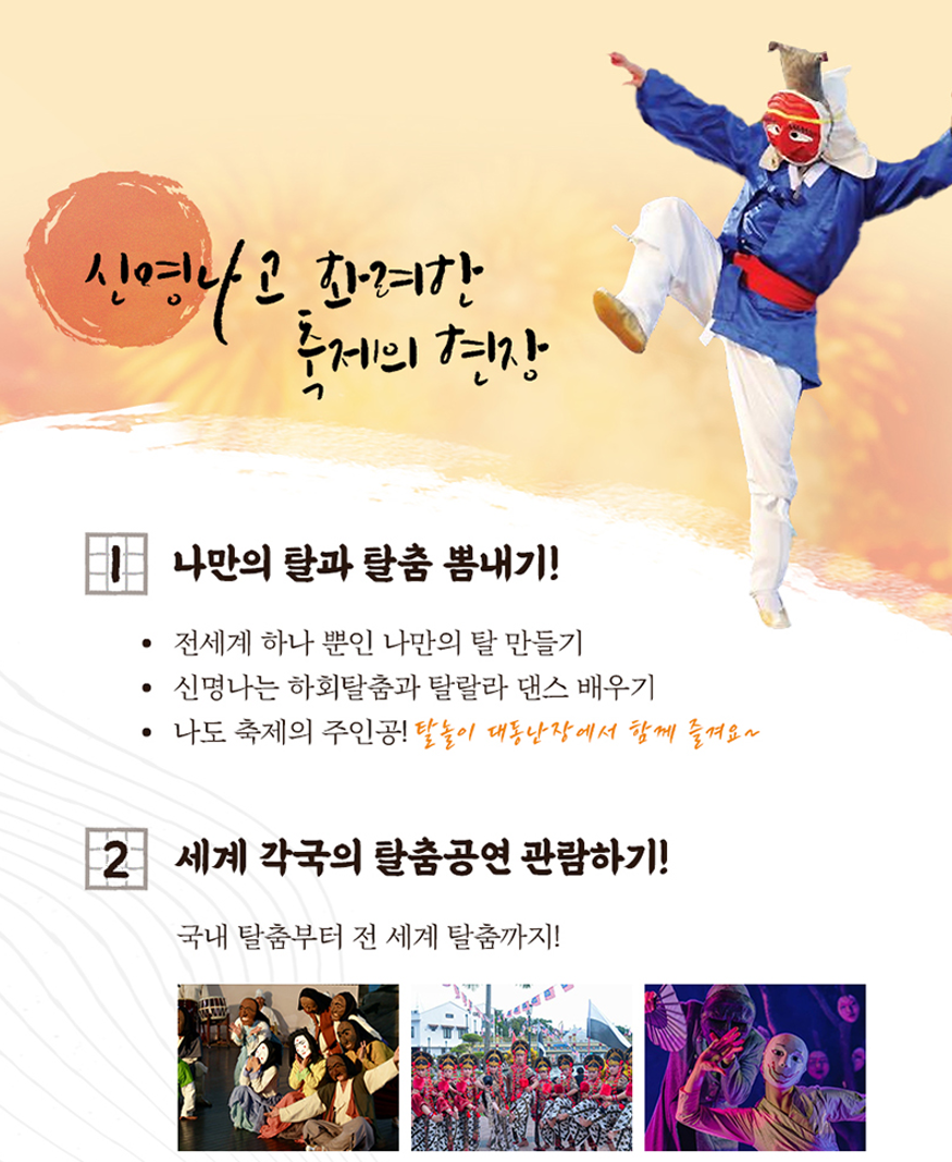 탈춤공원에는 국내외 탈춤공연과 각종 체험, 일반판매상가, 먹거리, 놀이동산 등이 운영됩니다. 벚꽃도로에는 다양한 탈과 탈춤 콘텐츠를 만나 볼 수 있는 탈 문화 테마거리를 조성합니다. 옛 기차역사 부지에는 메인무대와 다양한 먹거리, 볼거리, 살거리 등이 자리합니다. 원도심 공간에는 음식축제인 객주로드페스티벌과 시장상권 활성화 사업단의 이벤트 행사가 펼쳐집니다.