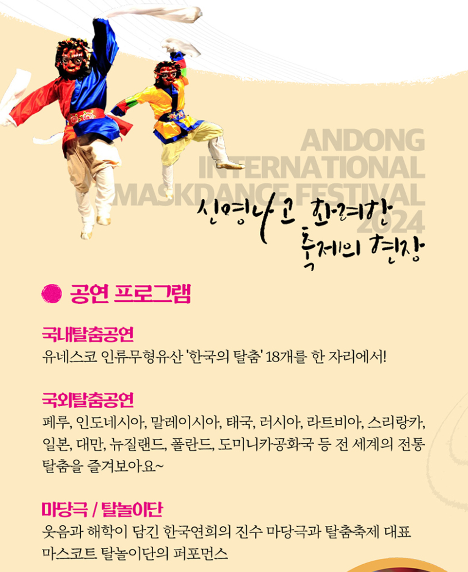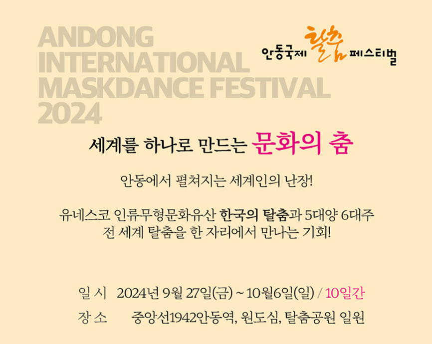 안동 국제 탈춤 페스티벌은 일정이 2024년 9월 27일 금요일부터 10월 6일 일요일까지 10일간 축제가 진행됩니다. 장소는 중앙선1942안동역, 원도심, 탈춤공원 일원에서 이뤄집니다. 유네스코 인류무형문화유산 한국의 탈춤과 5대양 6대주 전 세계 탈춤을 한 자리에서 만나볼 수 있습니다.
