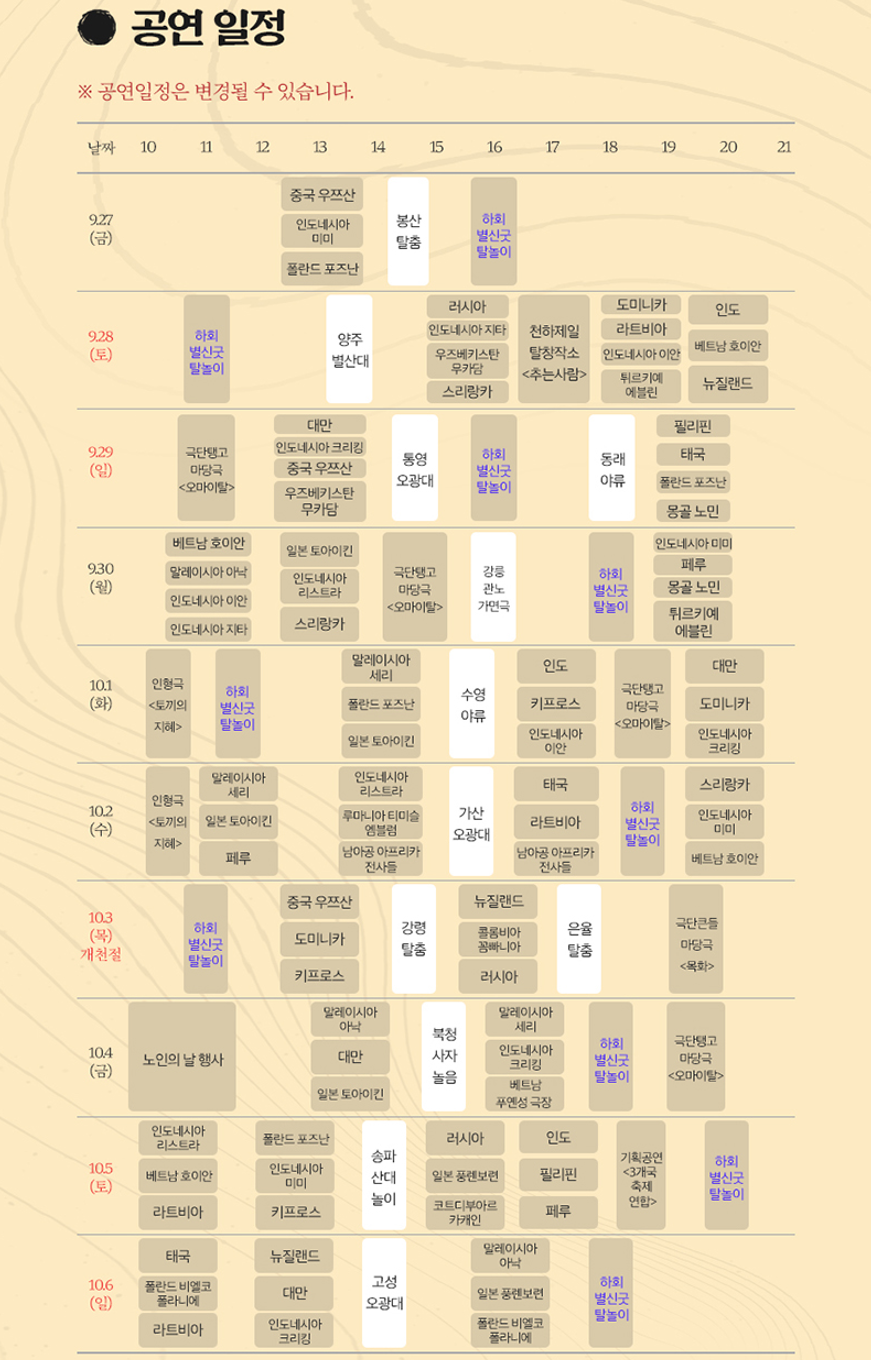 | 봉산탈춤 | 2024. 09. 27 (오후 2시 30분) | 탈춤공원, 탈춤공연장 |