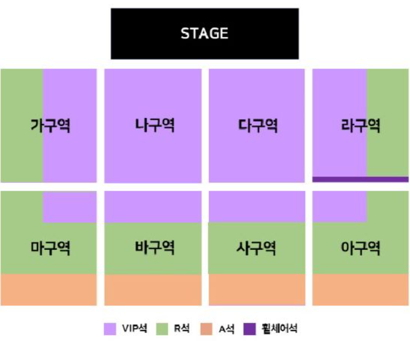 - 본 좌석배치도는 예매 시 이해를 돕기 위한 이미지로 공연 연출 상의 이유로 무대구성이 사전 공지 없이 변경될 수 있으며. 실제 무대와 차이가 있을 수 있습니다.