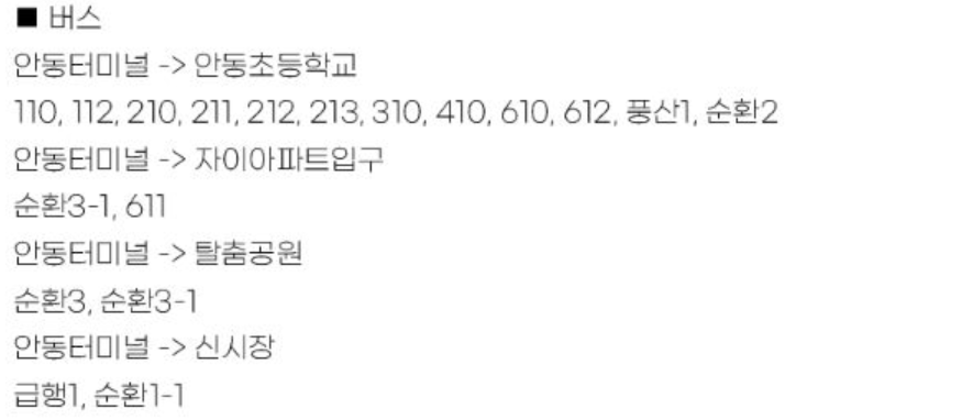 버스 110번, 112번, 210번, 211번, 212번, 213번, 310번, 410번, 610번, 612번 안동터미널 > 안동초등학교