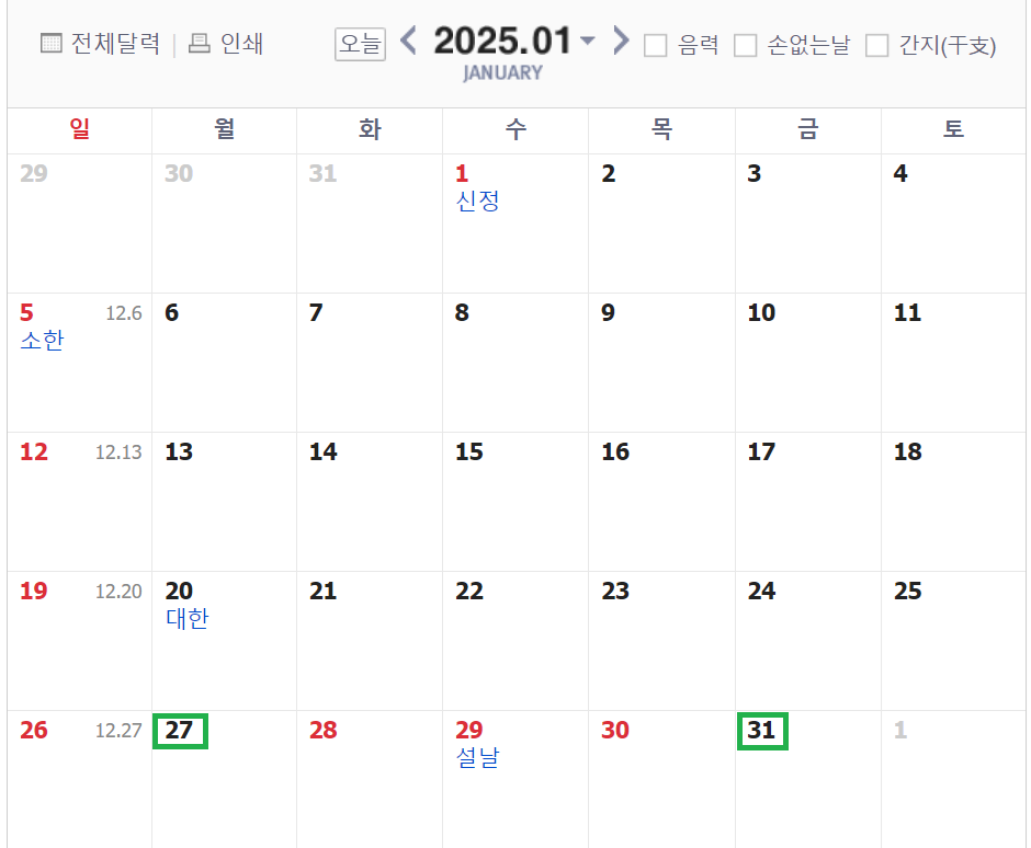 1월에는 1월 27일 월요일과 1월 31일 금요일에 연차를 사용한다면 최대 9일 휴가가 가능합니다.