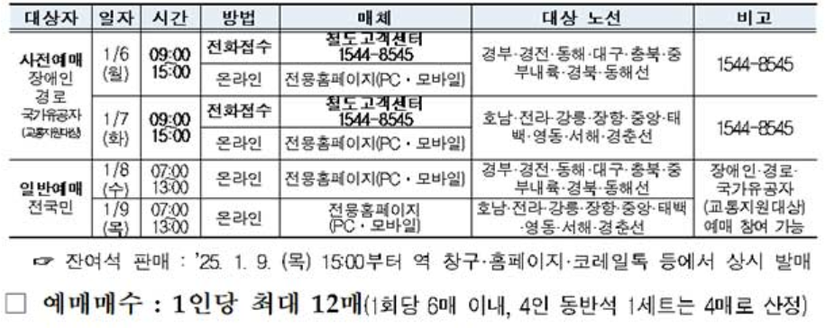| 1월 7일 (화) | 9시~15시 | 전화접수 | 철도고객센터 1544-8545 | 호남, 전라, 강릉, 장항, 중앙, 태백, 영동, 서해, 경춘선 | ||