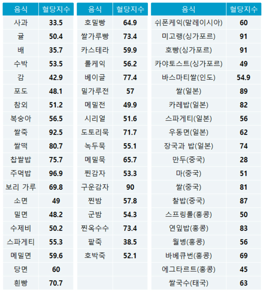 - 높은 GI지수(70 이상) : 혈당을 급격하게 상승시키는 음식으로, 과다 섭취 시 당뇨병 등의 건강 문제를 유발할 수 있음
