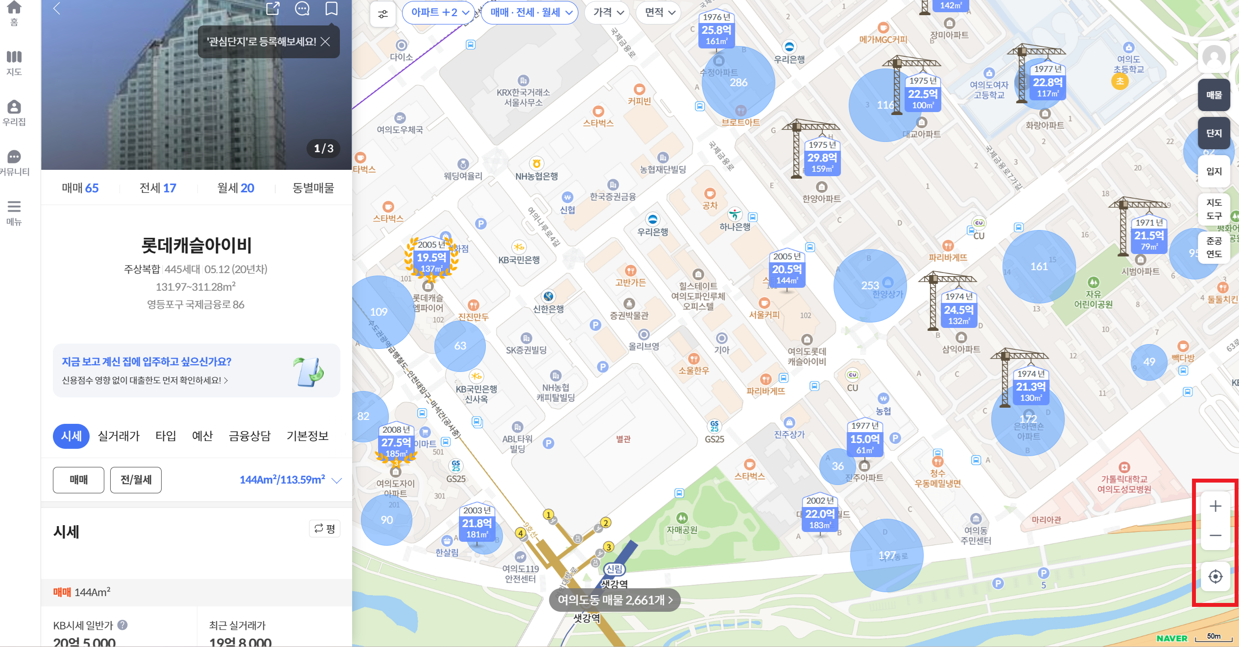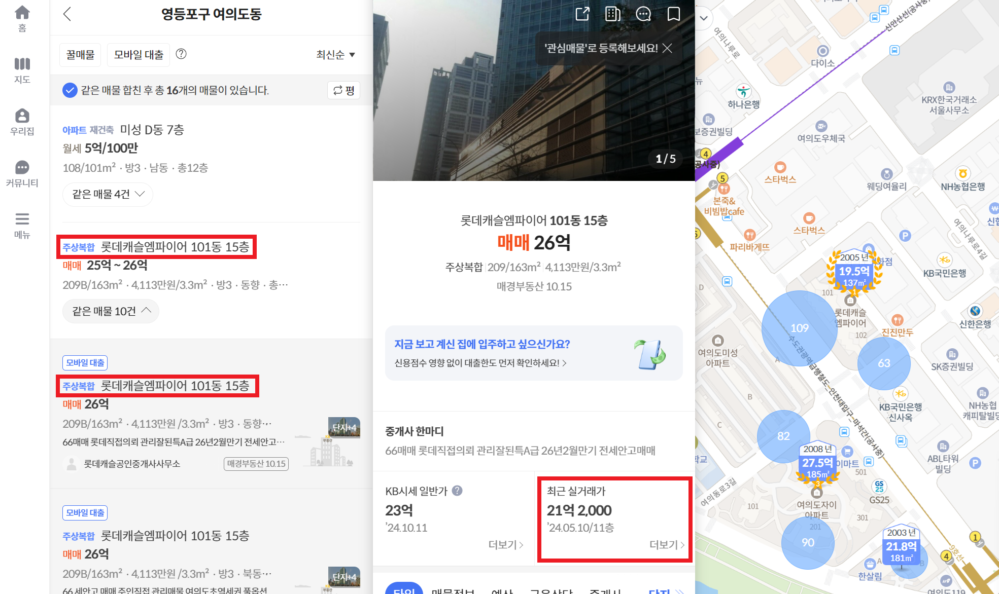 지도에서 원하는 아파트를 클릭하거나 검색하면 왼쪽에 사진과 함께 시세 정보를 확인할 수 있습니다.