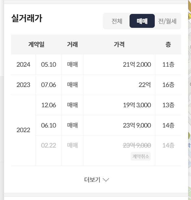 최근 실거래가에서 더보기 버튼을 누르면 상세하게 확인할 수 있습니다.