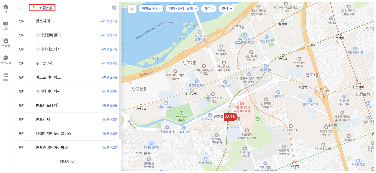 만약 원하는 지역이 있다면 검색란에 아파트명이나 지역을 기입하여 검색합니다.